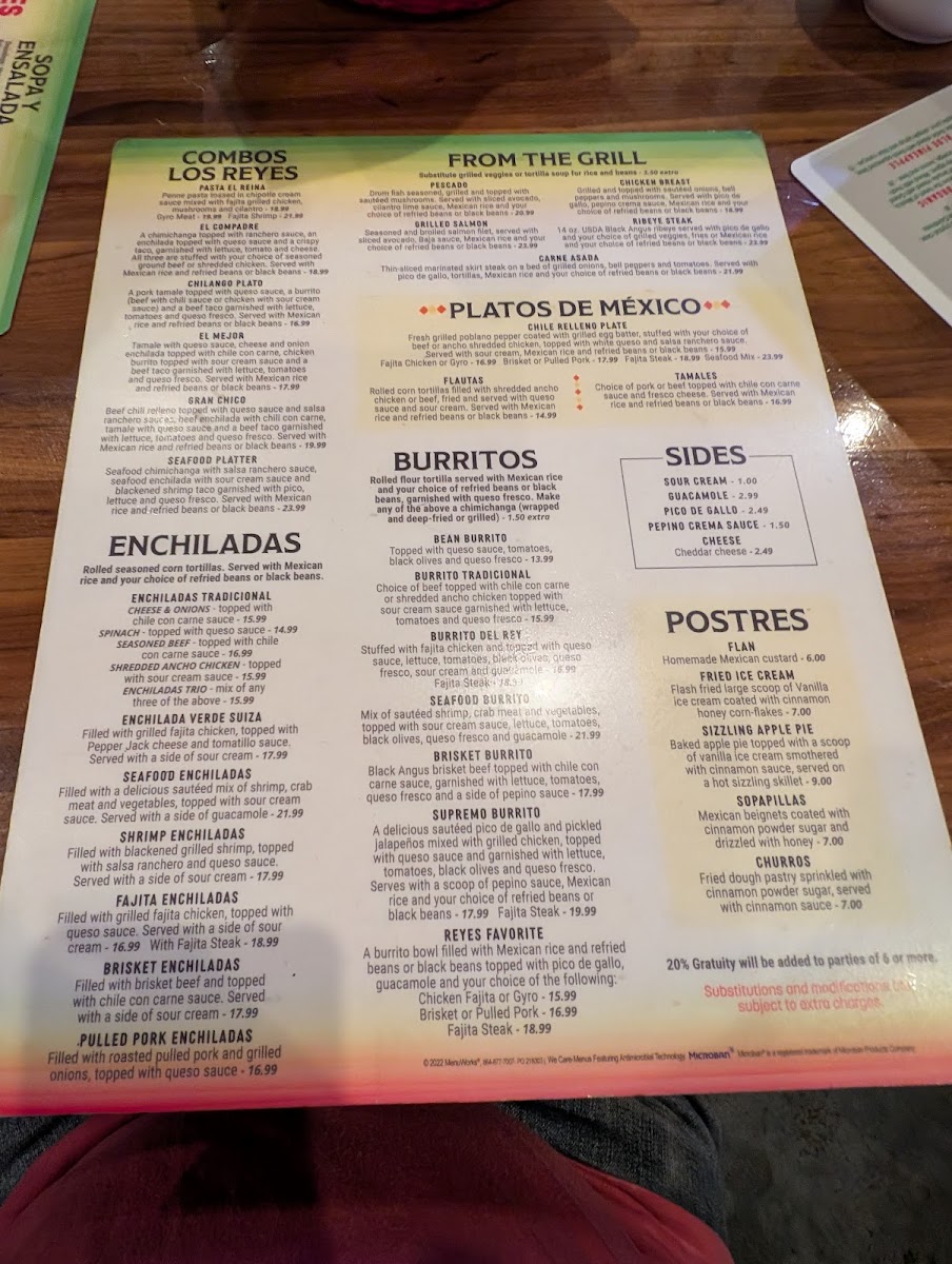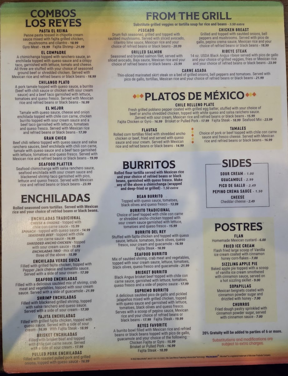 Two Pork or beef, topped with chili con carne sauce, garnished with queso fresco. Served with Mexican rice and choice of refried beans or black beans.
